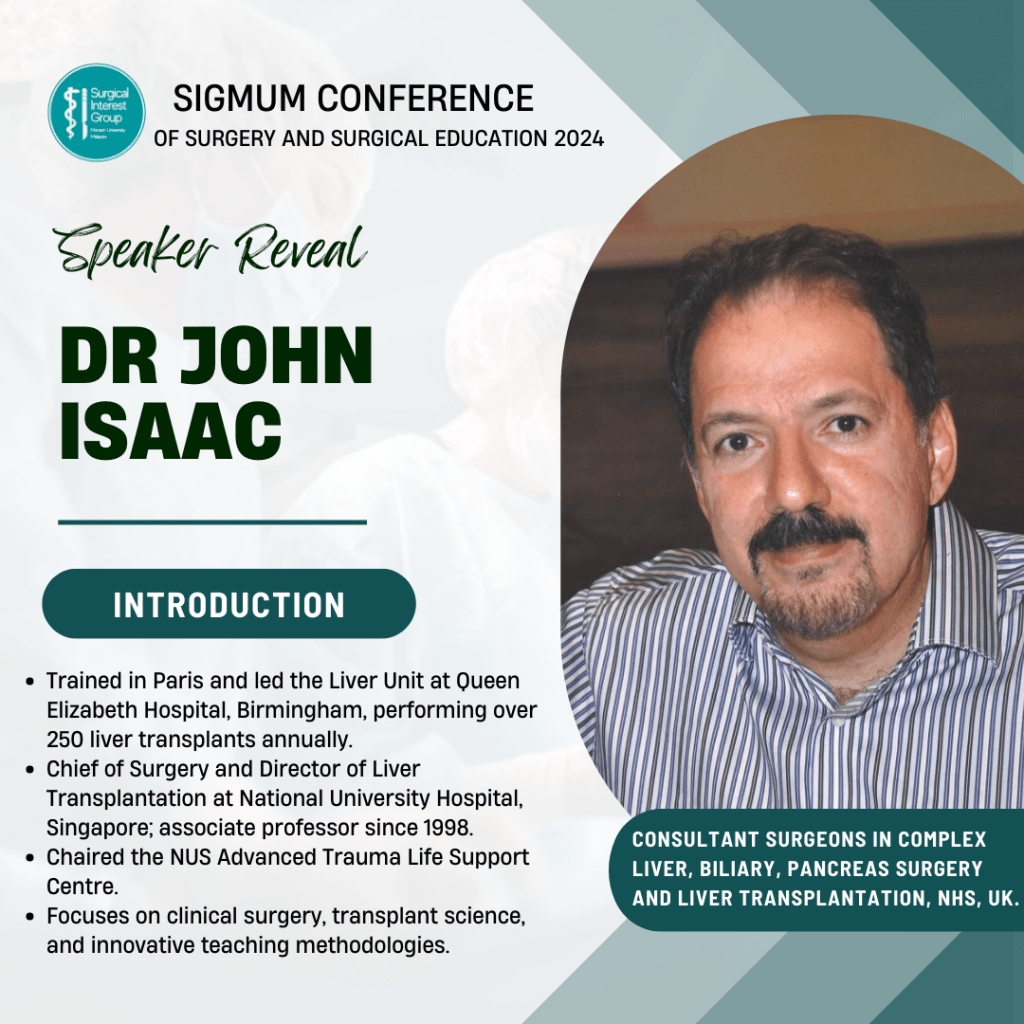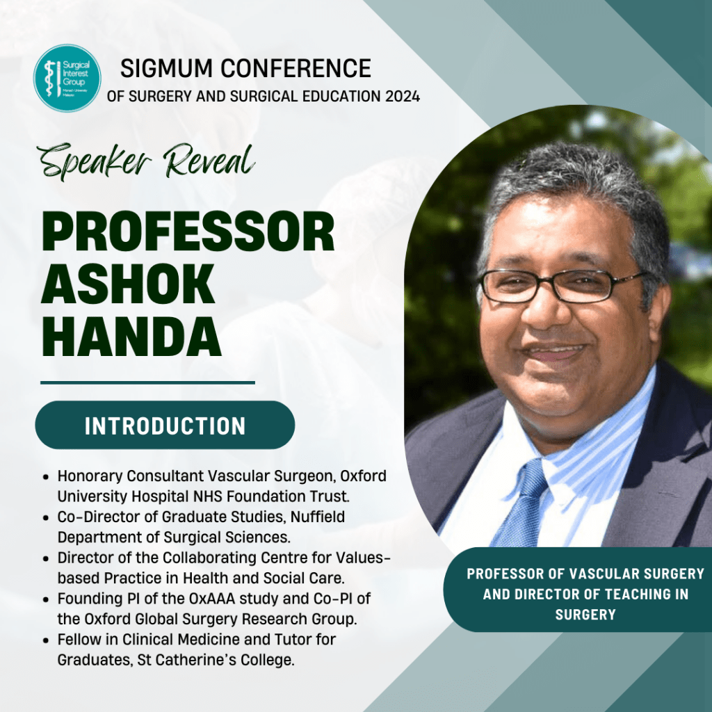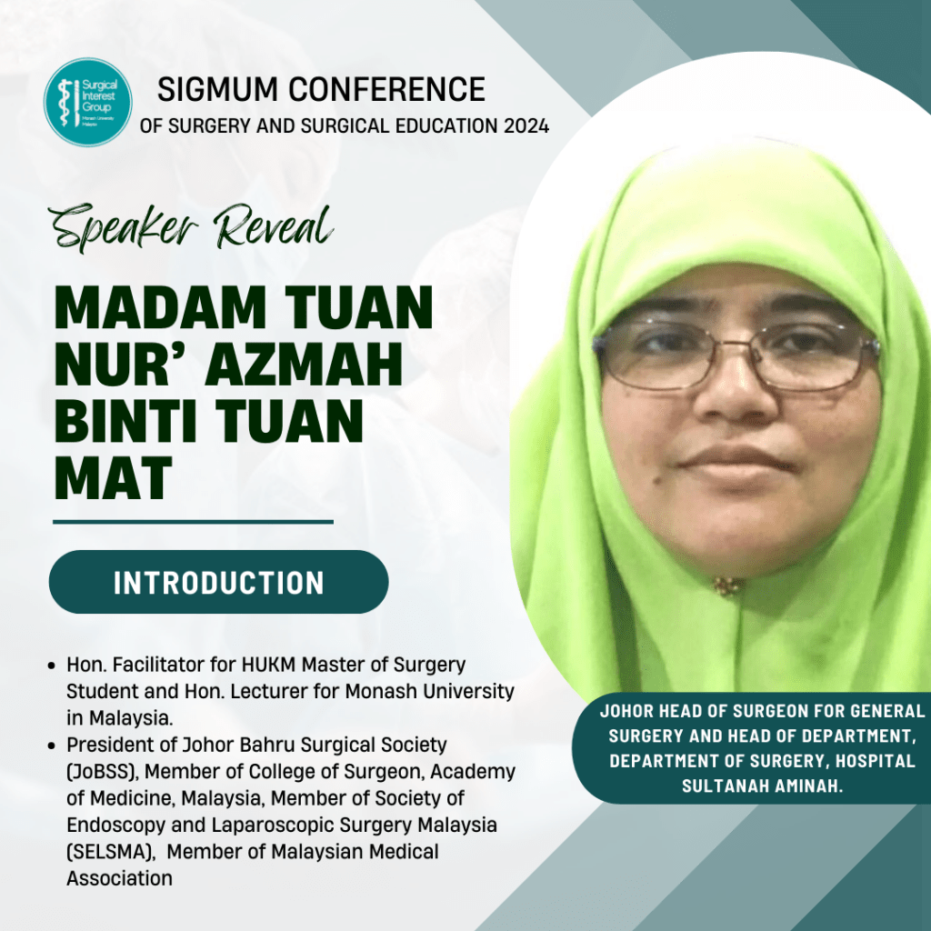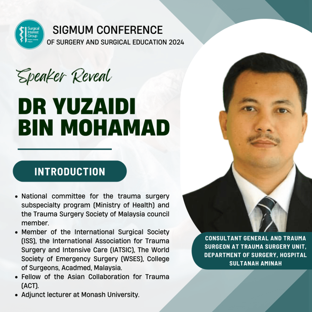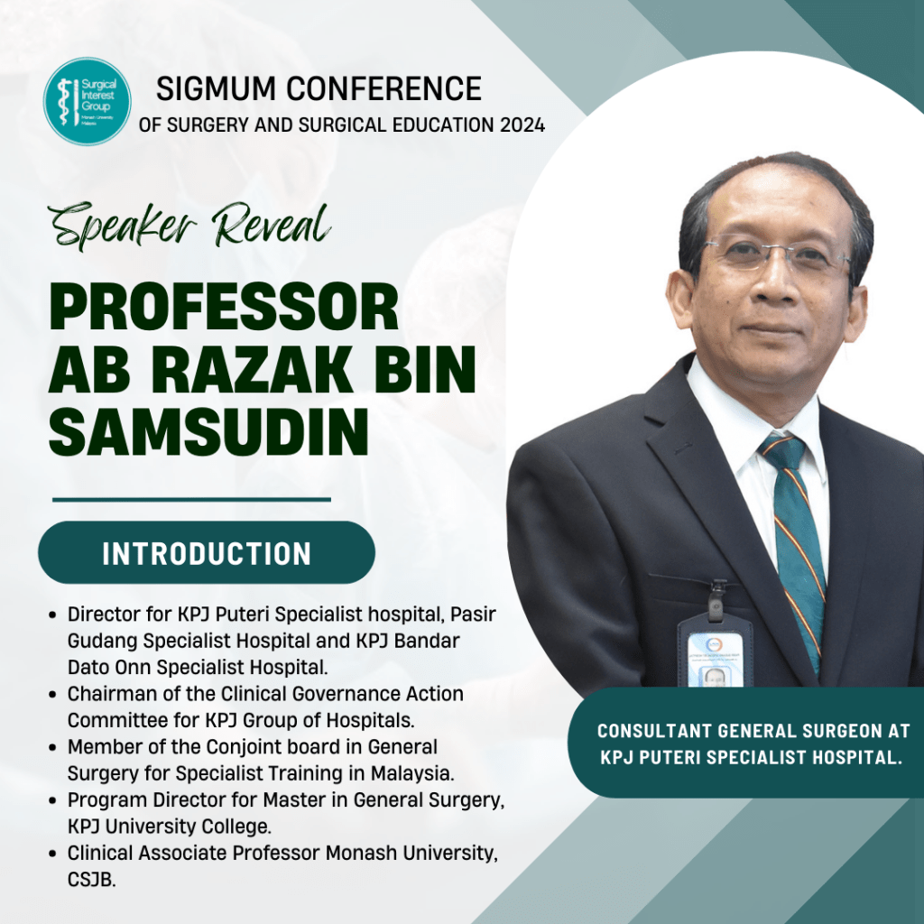 The SIGMUM Conference of Surgery and Surgical Education 2024 was held on 27th and 28th July at Clinical School Johor Bahru, Monash University Malaysia. The conference was organised by the Surgical Interest Group of Monash University Malaysia (SIGMUM) with Professor Anil Gandhi’s guidance and support. The conference aims to provide a platform for networking and to ignite a passion for surgery.